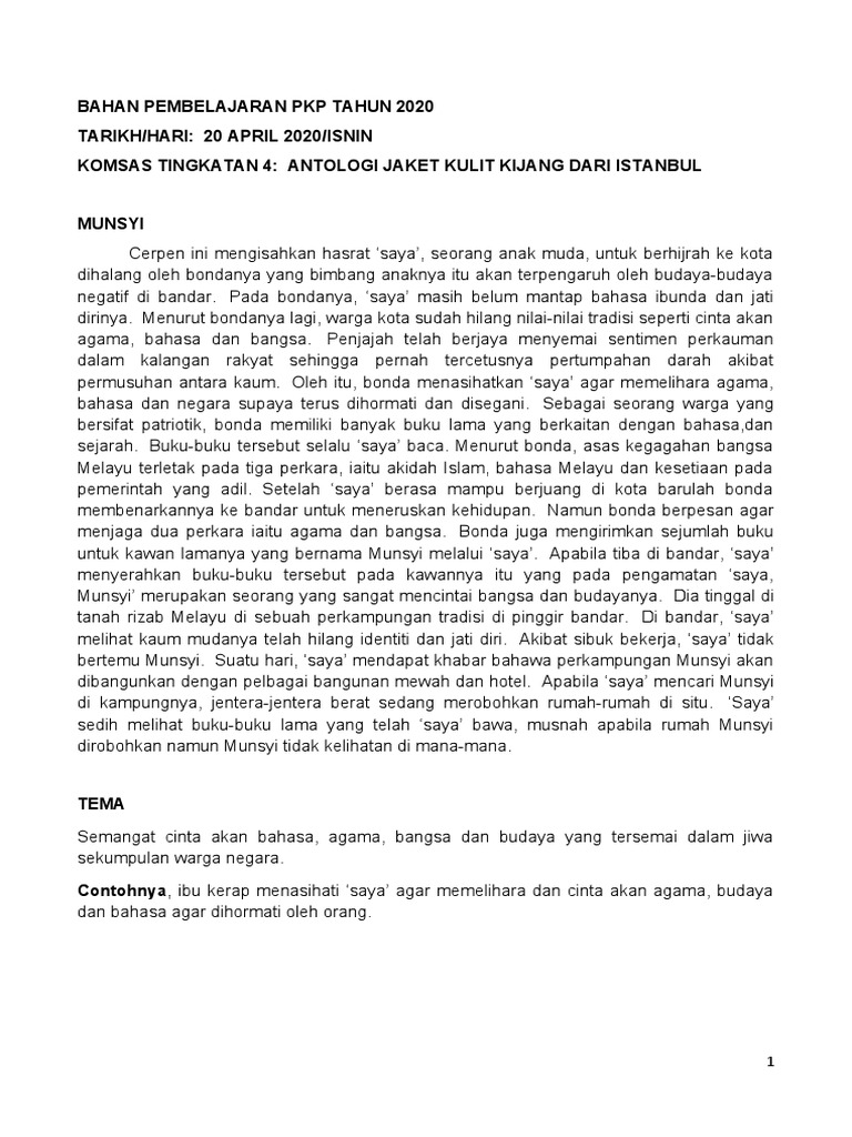 Antologi tingkatan 4 jaket kulit kijang dari istanbulanimasi cerpendireka cipta oleh myteach sdn bhdproduk dalam bentuk powerpoint atm (advance te. Cerpen munsyi (husna nazri) tingkatan 4. Kali ini kami akan kongsikan nota komsas tingkatan 4 cerpen bertajuk munsyi. Soalan cerpen munsyi komsas tingkatan 4. Most of them are worried (=apprehensive) that the use of internet is dangerous to their kids. Contohnya, ibu kerap menasihati 'saya' agar memelihara dan cinta akan agama, budaya dan bahasa agar dihormati oleh orang. Soalan penulisan, soalan pentaksiran, soalan penanda wacana, soalan pengetahuan am, soalan pendidikan seni, soalan pendidikan islam, soalan pendidikan jasmani, soalan pengurusan kewangan, soalan pendidikan moral spm, soalan pengajian malaysia 2, soalan pengetahuan am dunia, soalan penyelia pejabat brunei. Soalan sains pt3 2019 bocor; Online uitm edu my surat tawaran occupational safety and health administration osha legislation is an example of quizlet office space for rent los angeles ca online. Nowadays (=in this day and age), the use of internet is increasing especially among teens (=adolescence) or more accurately, students. Share nota komsas tingkatan 4 everywhere for free. Binaan plot add to my workbooks (0) download file pdf embed in my website or blog add to google classroom add to microsoft teams share through whatsapp: (mulai 2015 untuk spm 2016) (dikemas kini pada 21/12/2018) sila klik imej teks dan pautan pilihan anda di bawah untuk ke submenu teks berkenaan.